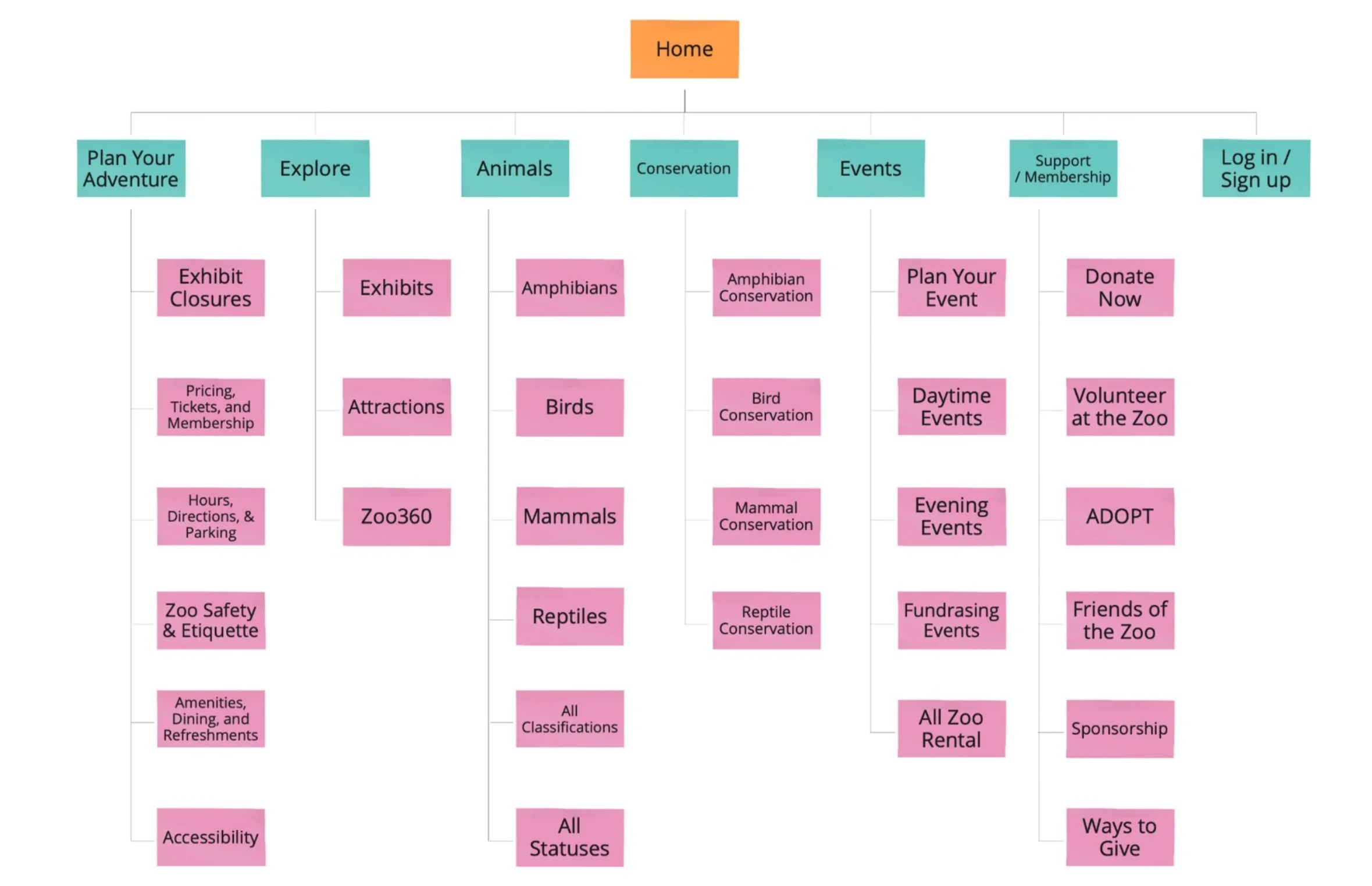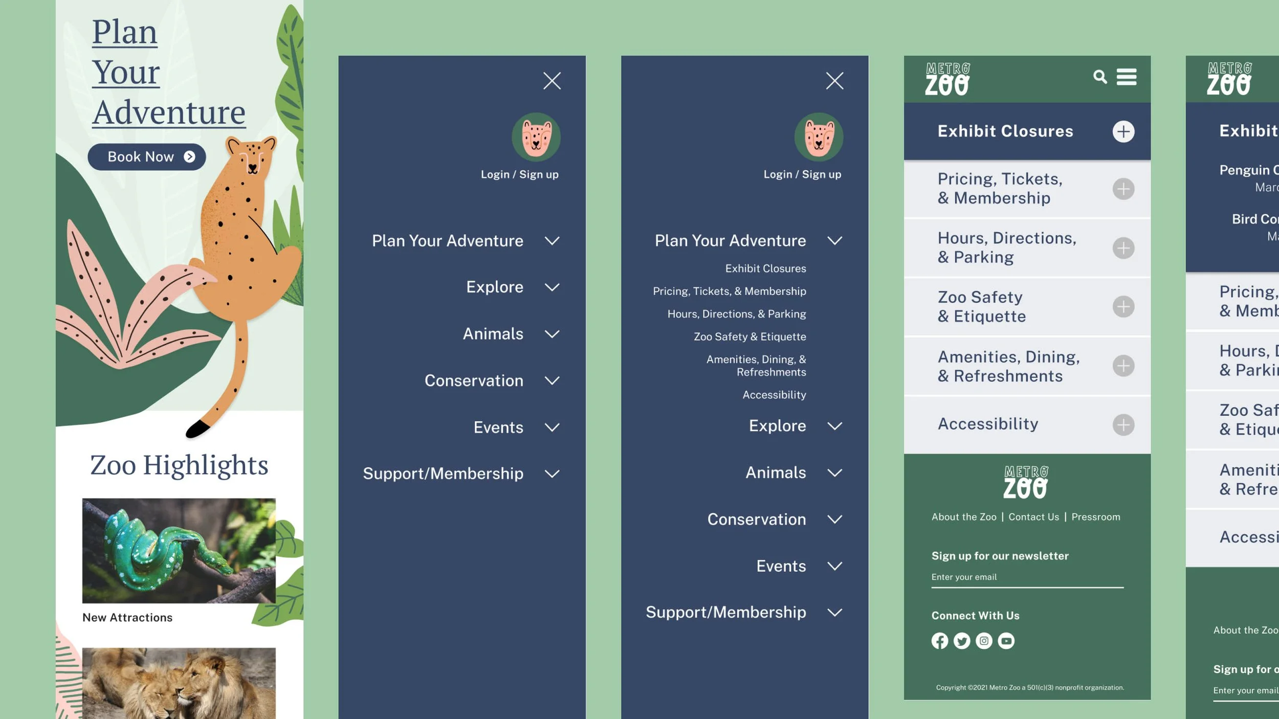This site map provides a high-level overview of the app’s sections. Covering planning your visit or “adventure”, exhibit closures, attractions, conservation efforts, memberships, and logins/sign-ups for new and returning visitors.