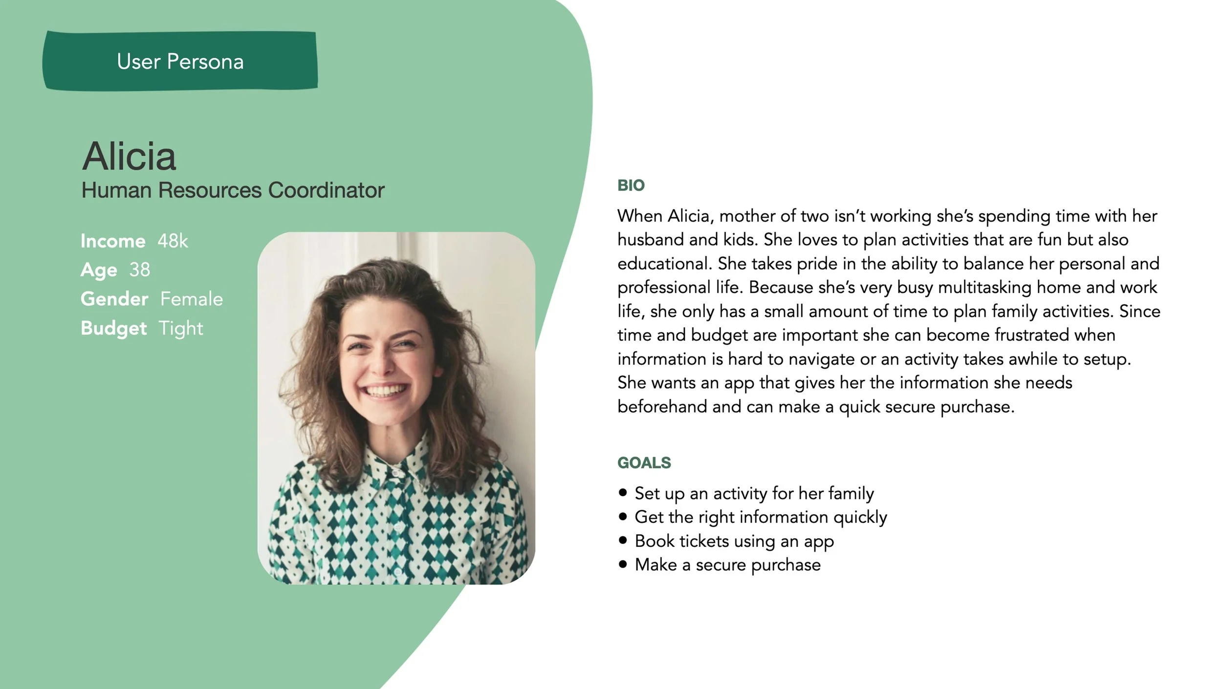Alicia was created as a User Persona to highlight the challenges and frustrations of booking a visit to the zoo. As a working mom, time is tight and budget is even tighter, so booking an experience should be easy and seamless for her.